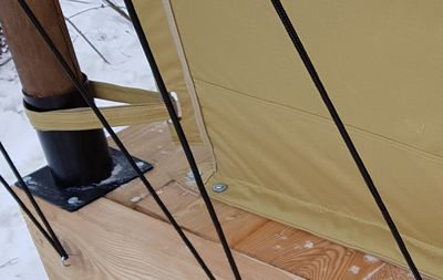 Крепление стен отепления разное: преимущественно на самом тенте палатки установлена широкая липа, ответная часть закреплена на стенах отепления. По крыше и системе натяжения дополнительно идет усиление из ПВХ вставок и скоб натяжения, которое абсолютно не заметно под крышей и 100% надежно.